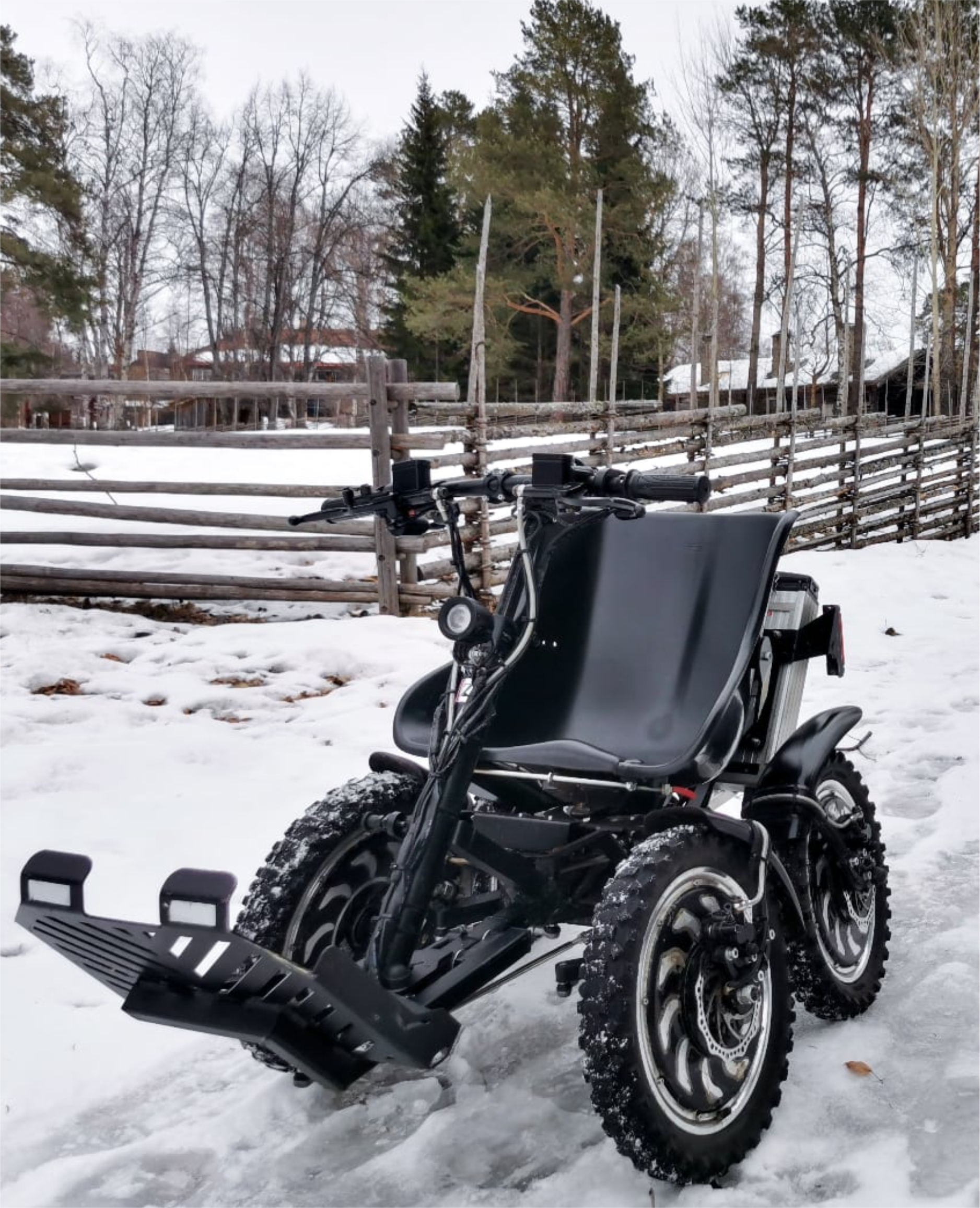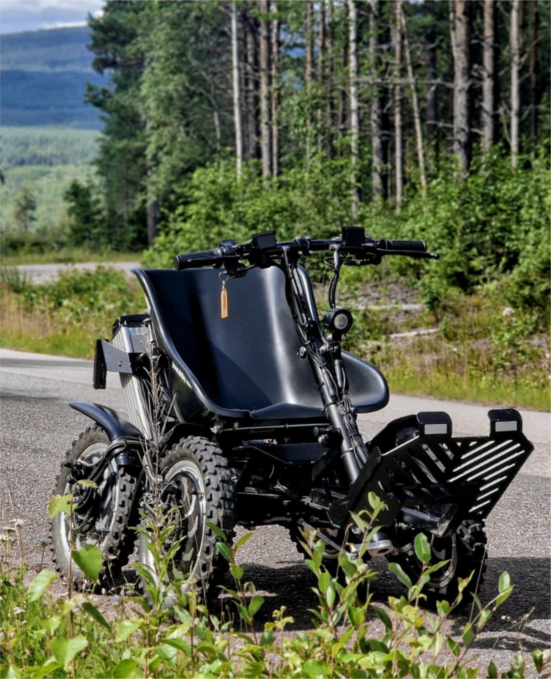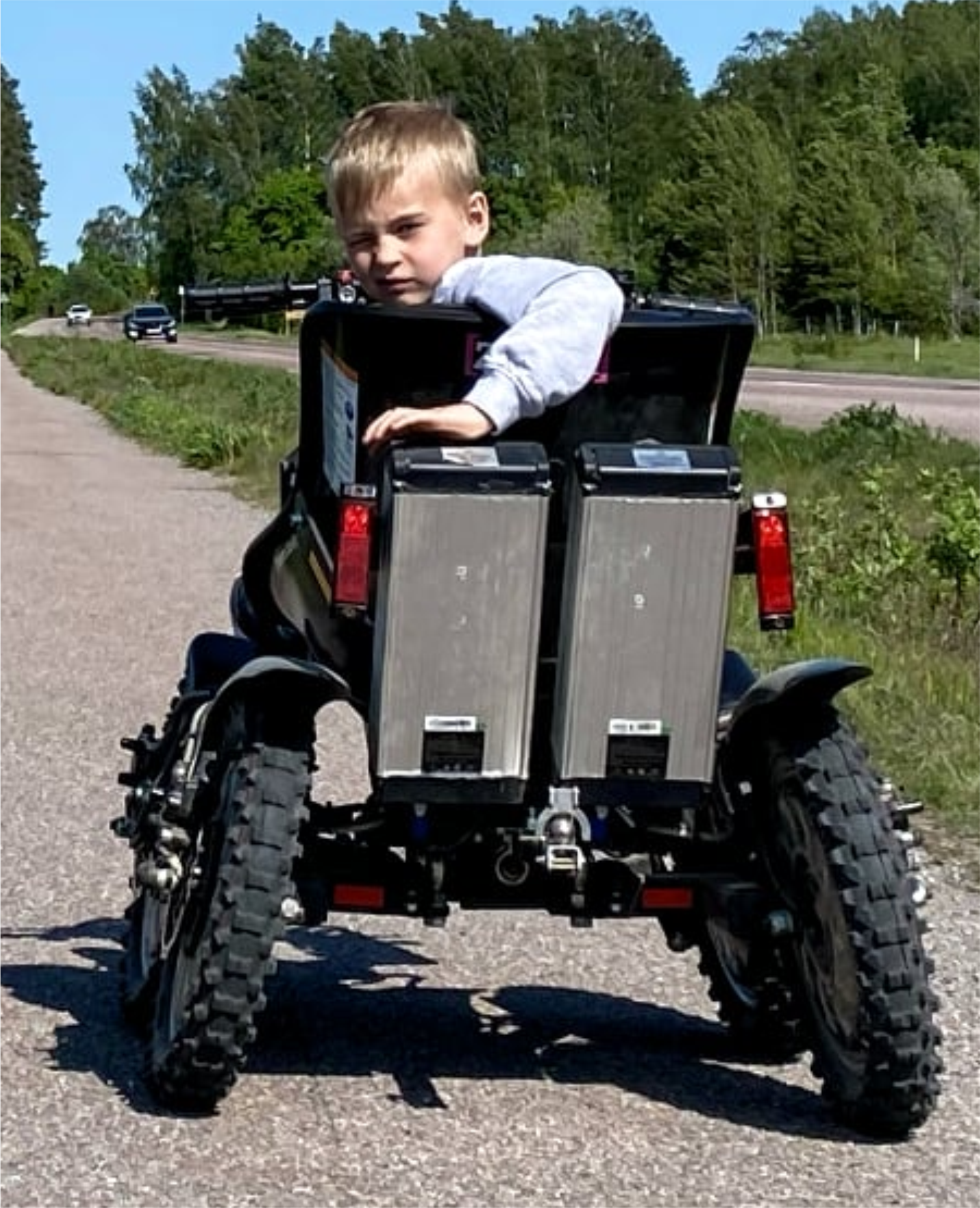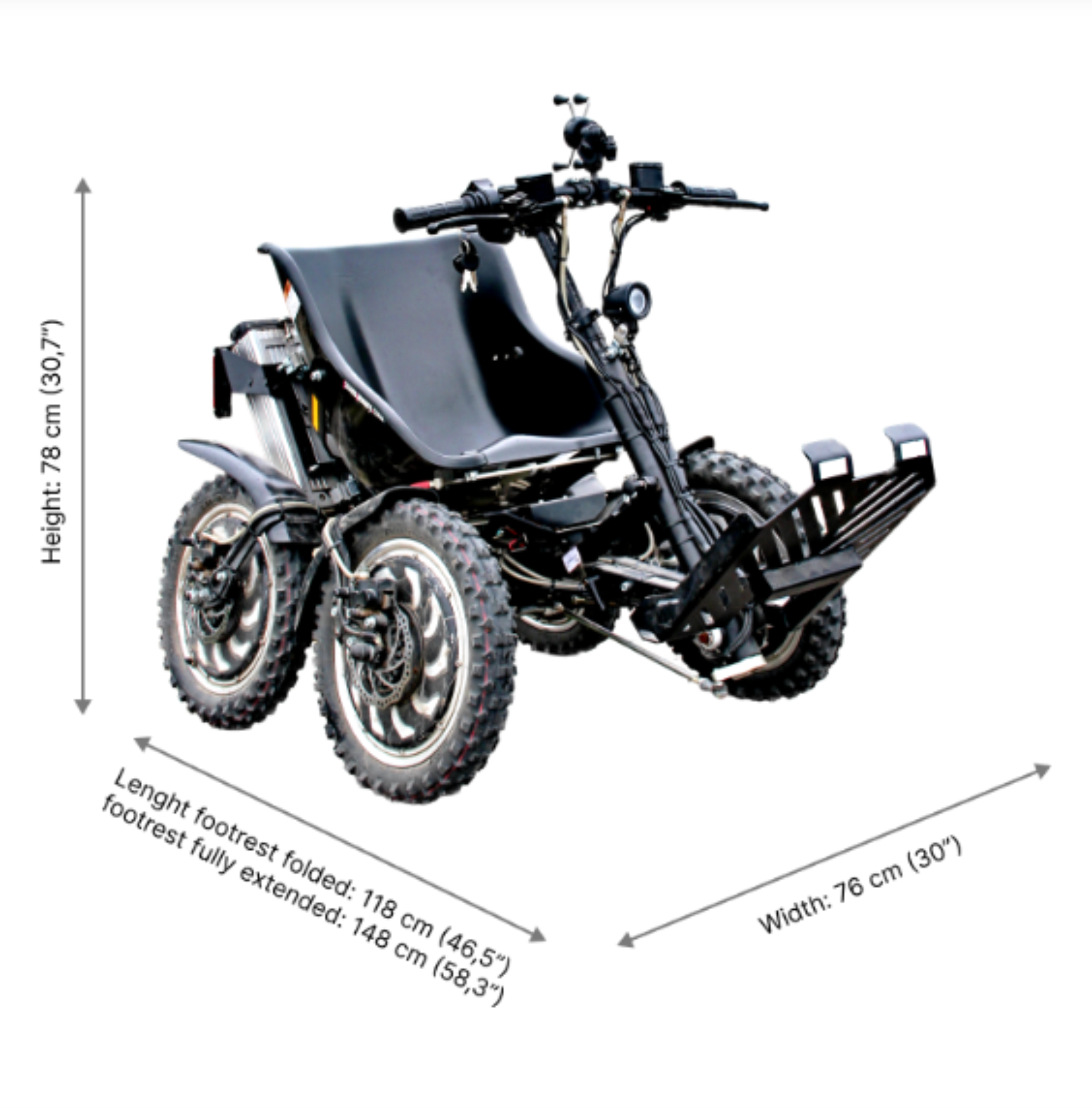 Permanent symmetrical 4-wheel drive Hub motors: 4 three phase, 0-gear [forward/reverse] Aluminum wheels Black mudguards Maximum speed: 20 km/h [12,6 mph] Acceleration: 0-20 km/h (0-12,6 mph) less than 2 seconds Torque: 4 x 52,5 NM [210 NM] Output: 4 x 1000 W [4 kW] Batteries: 2 x 48V / 10Ah [LiFePO4 Battery Cells] Maximum range standard battery: 40 km (25 miles) Number of charging cycles: >800 Charging time: approx. 2-4 hours Frame: steel Weight: 108 kg (238 pounds) Ground clearance: 17 cm (7 inches) Track width, center/center: 65 cm (26 inches) Tires 12×2.5” air-rubber tire with cross tread pattern Speed control: Motorcycle-style twist grip, or thumb throttle Brakes: Two-circuit hydraulic, disk brake system Cruise control Fixed speed regulator: 5, 10, 20 km/h (3.0, 6.3 and 12,4 mph) Recommended maximum weight of driver: 136 kg (300 lbs)